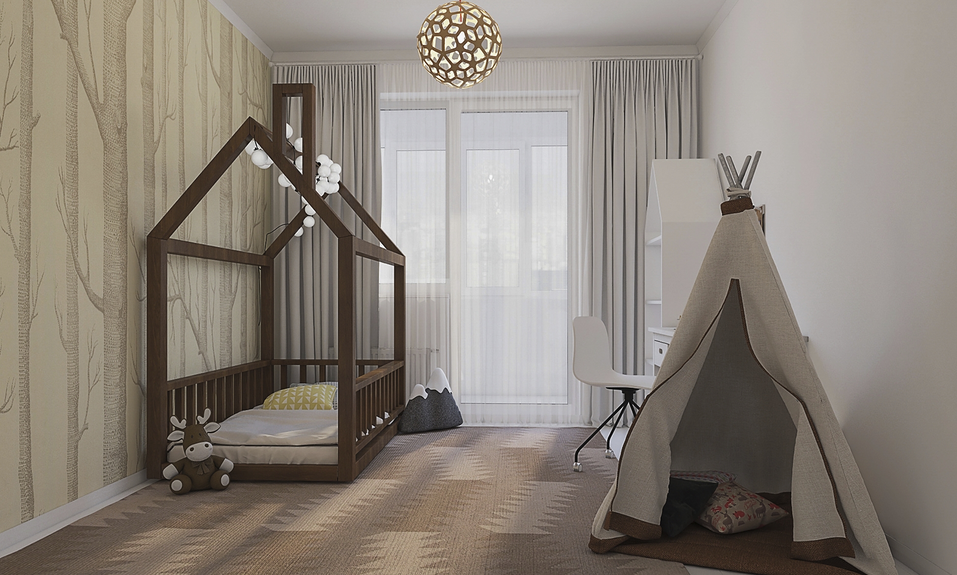 Главное в этом возрасте — безопасность и удобство для родителей. Ребёнок ещё не отделяет себя от мамы, поэтому комната часто становится продолжением спальни родителей.